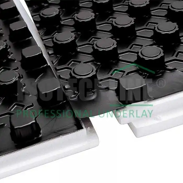 Placa din polistiren cu nuturi are o folie hidroizolanta de culoare negru, atasata pe suprafata stratului de EPS si asigura o distributie perfecta a caldurii pe intreaga pardoseala, pentru un confort termic excelent.